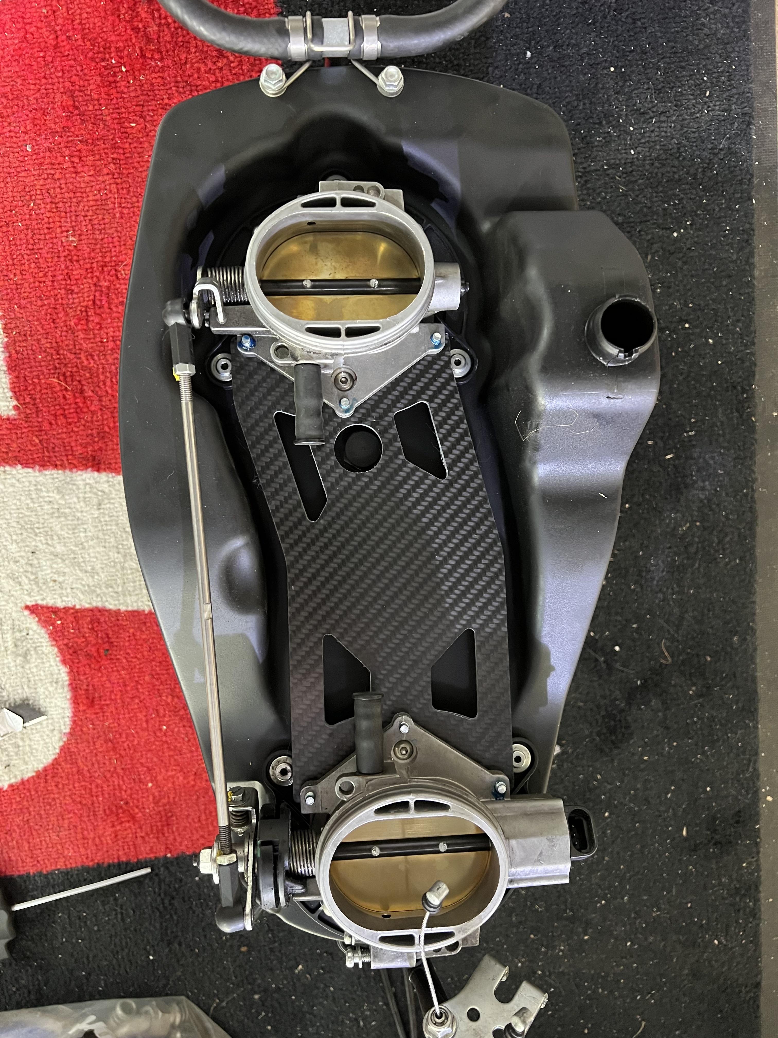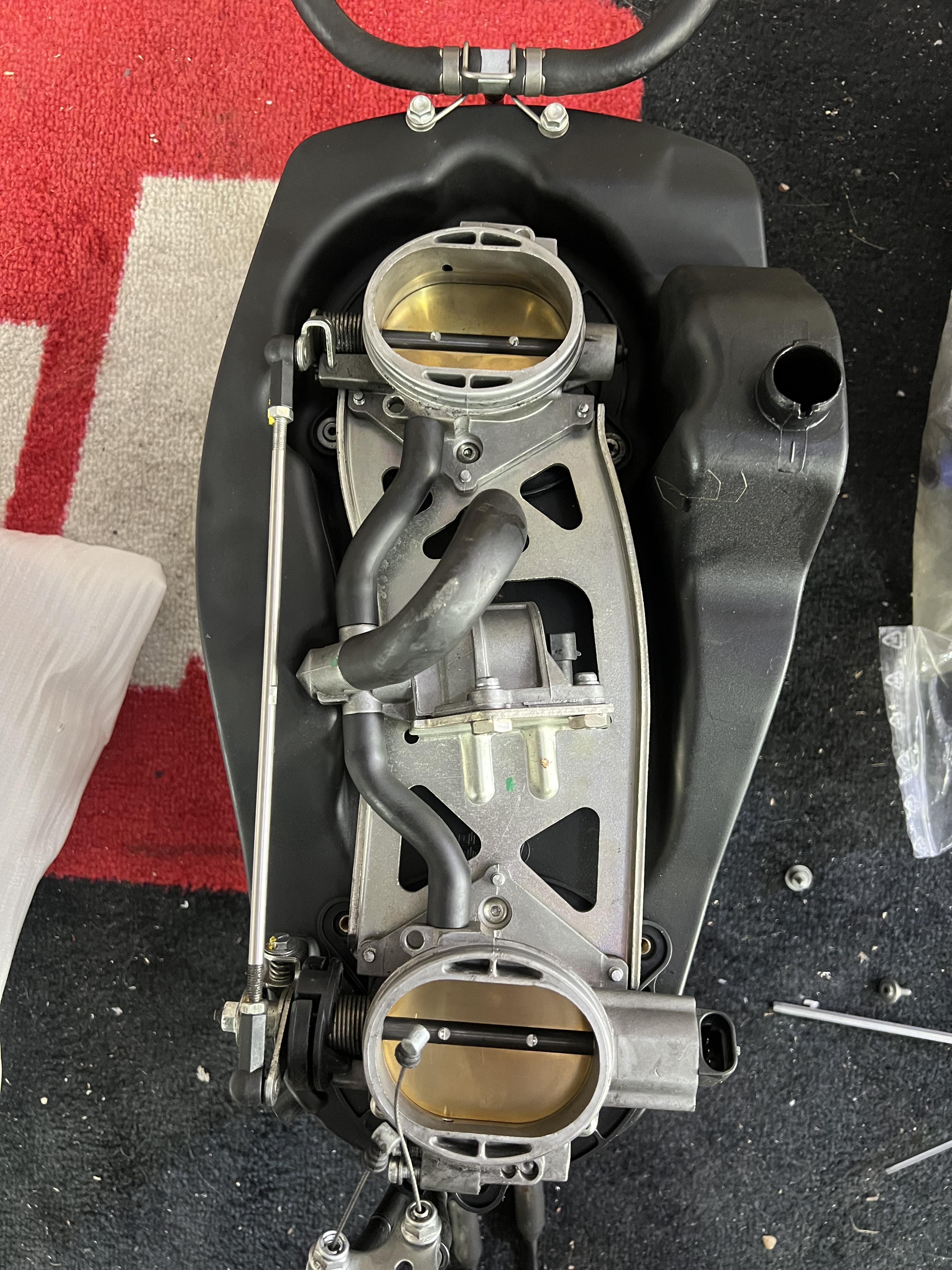 Was ich gestern auch noch gemacht habe, ist das Sekundärluftsystem und den Steppermotor raus geschmissen. Die Originale Platte wiegt gefühlt 10kg. Und den langen Anschlussstutzen unten an der Aurbox hab ich komplett entfernt. Das Ding stört ziemlich beim Abnehmen der Airbox. Ohne, flutscht die Airbox wie von alleine wieder drauf. -