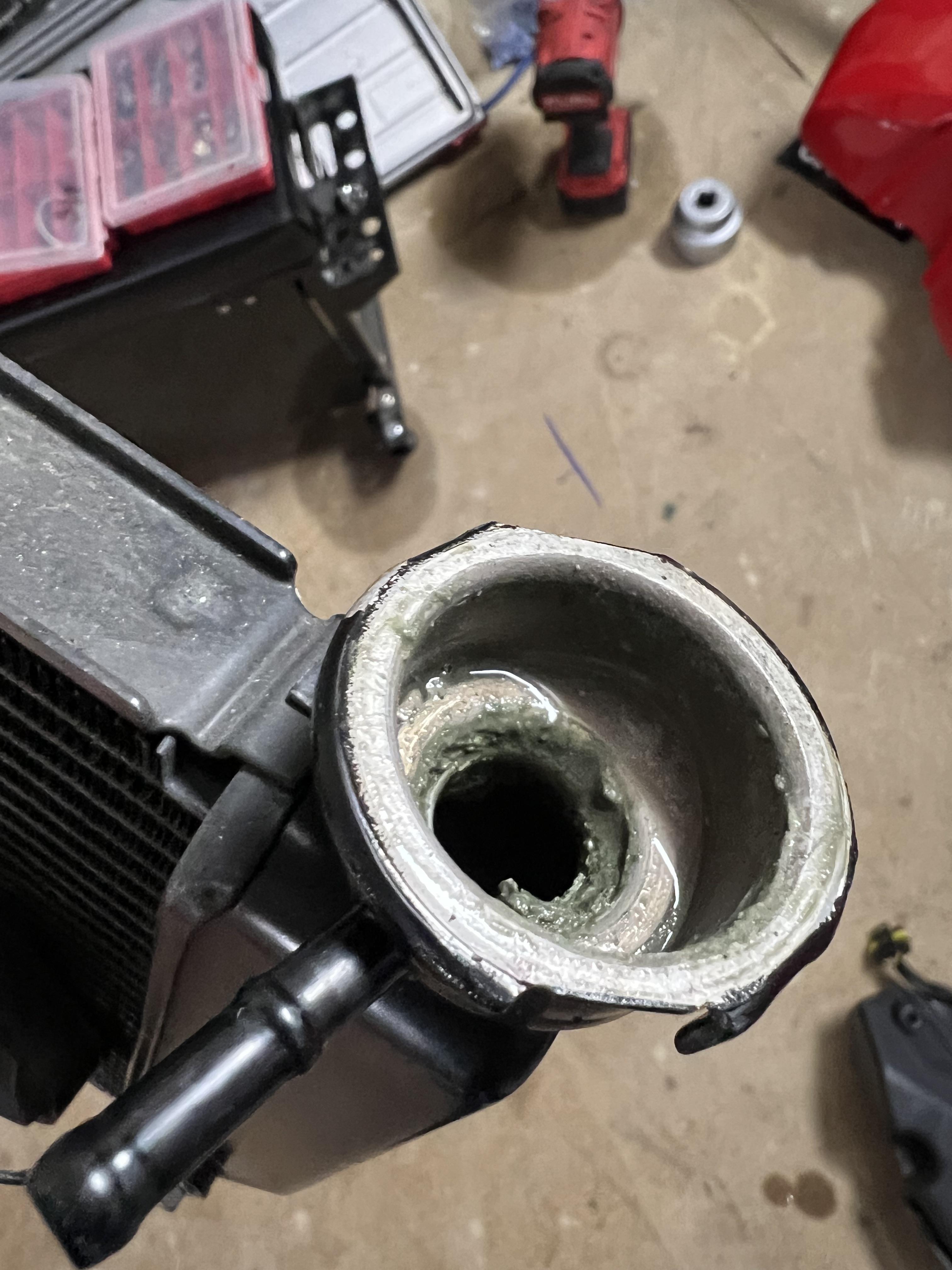 Was gestern nach der Arbeit schon passiert ist, ich habe die alten Kühlerschläuche gegen Samco Schläuche getaucht. Viele machen die in blau, aber das wird mir schon wieder zu bunt. Ein paar neue Schlauchschellen gab es auch dazu. Den Kühler hab ich vorerst mal gespült, da hat sich vor allem am Einlass schon schlage abgelagert. Wenn alles wieder zusammen ist, wird das ganze Kühlssystem auch nochma gespült um sicher zu gehen, das sich dort nicht noch weitere Ablagerungen gesammelt haben. -