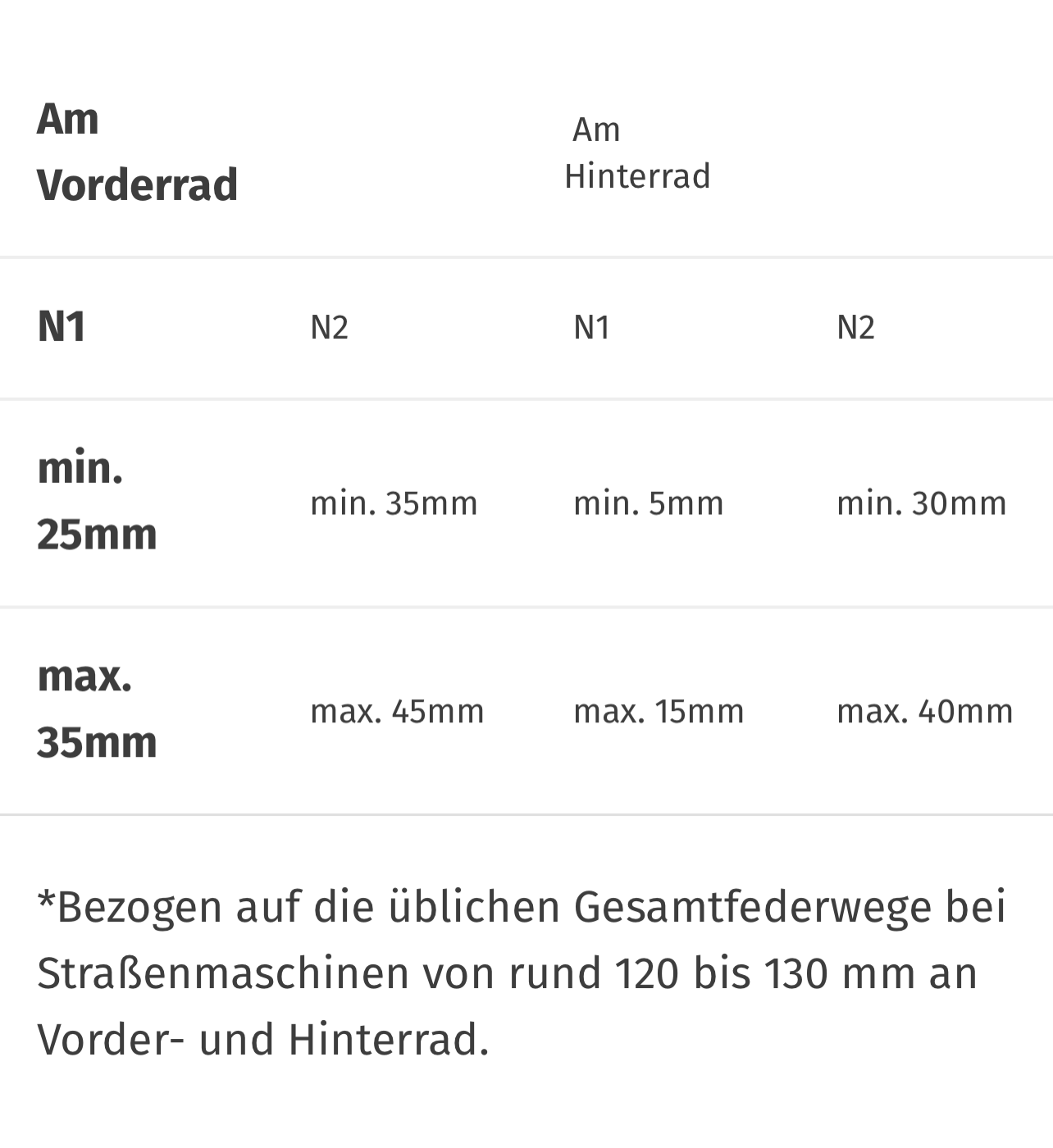 Hier mal paar Richtlinien aus der Motorrad: N1 = Eigengewicht des Motorrads N2 = Eigengewicht des Motorrads + Fahrer Wenn die Feder für dich deutlich zu hart ist, wird N1 zu groß werden. Da muss man aber auch aufpassen. Ein sehr schneller Fahrer wird immer härtere Federn fahren, auch wenn der ne Brechbohne ist. -