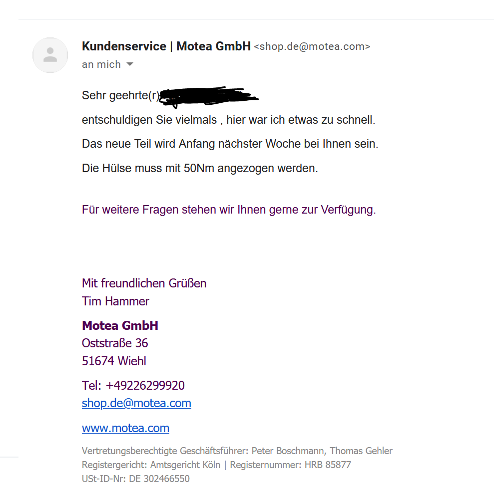 lunschi Geschrieben 15. Dezember 2020 Geschrieben 15. Dezember 2020 vor 9 Stunden schrieb MusterMax: Auf nochmaliges Nachfage bei MOTEA hab ich jetzt auch die info bekommen das die Schraube der Hülse mit 90Nm angezogen wird! Werd dann wohl mal nachziehen gehen.. ...besonders fundiert war dann die erste Angabe wohl nicht... Soviel dazu. Gut das wir darüber gesprochen haben. Kai 1 ++