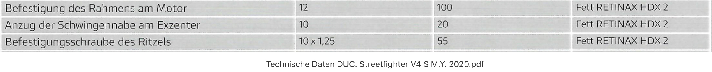 lunschi Geschrieben 12. Dezember 2020 Geschrieben 12. Dezember 2020 vor 24 Minuten schrieb MusterMax: Die 50Nm hab ich vom Motea Support per E-Mail gesdagt bekommen, weil in der Anleitung nichts dazu geschrieben stand. Fahre so aber schon seit 6000km also hält auf jeden Fall. Also für M12 wäre 50 Nm recht wenig das ist eher so ein Wert für M10-Schrauben... Für die Panigale hab ich das hier gefunden: Also da würde ich noch mal nachhaken. Kai 1 ++