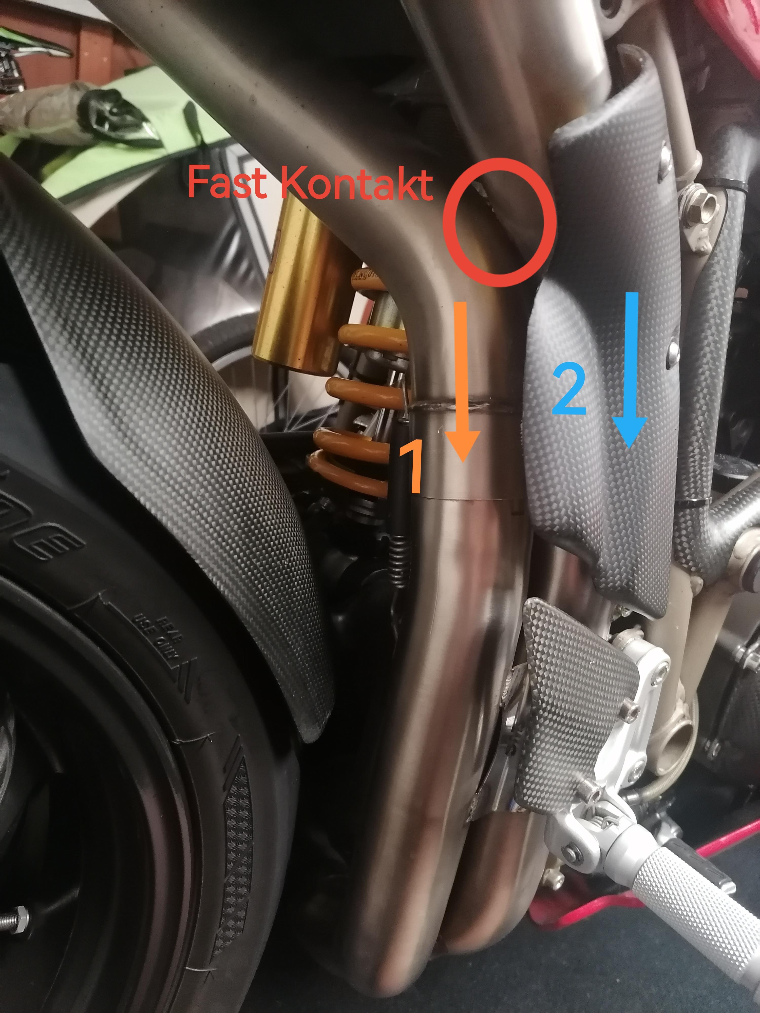 ktre Geschrieben 21. Mai 2024 Geschrieben 21. Mai 2024 vor 13 Minuten schrieb Janis: naja, wenn ich das jetzt alles richtig gelesen hab, dann trifft das innere rohr am Endtopf nun auf das innere Hosenrohr. Das ist das was ich meinte mit vorher messen. Denke nicht, dass du vor dem kürzen weniger weit drin warst. ... und ist der Vordere Sammler Anschluss nicht der rechte Topf? Du hast doch links das Problem. Bei mir ist das Rohrgeschlängel auch sehr eng. Ich müsste zuerst den hinteren Anschluss weiter rein stecken (1), damit das Vordere Krümmerstück (2) weiter runter kann. Das liegt ja direkt drüber, bei mir ist da fast Kontakt. Ziemlich wahrscheinlich, ja! Da wird auch Kupferpaste nichts helfen...warum die Konstruktion so ist und nicht wie beim BOS verstehe ich noch immer nicht. Bei mir ist links das Problem mit dem Heck, genau. Aber das eigentlich Problem ist ja auch, dass das Ding nicht weit genug drin steckt...also nur Probleme! Habe auch den linken zuerst reingesteckt, komme aber wie gesagt, mit beiden exakt gleich wenig rein. Bei dir ist das wirklich massiv eng, schaut aber sehr fesch aus das ganze Ding! 🙂 ++
