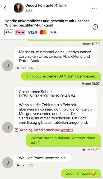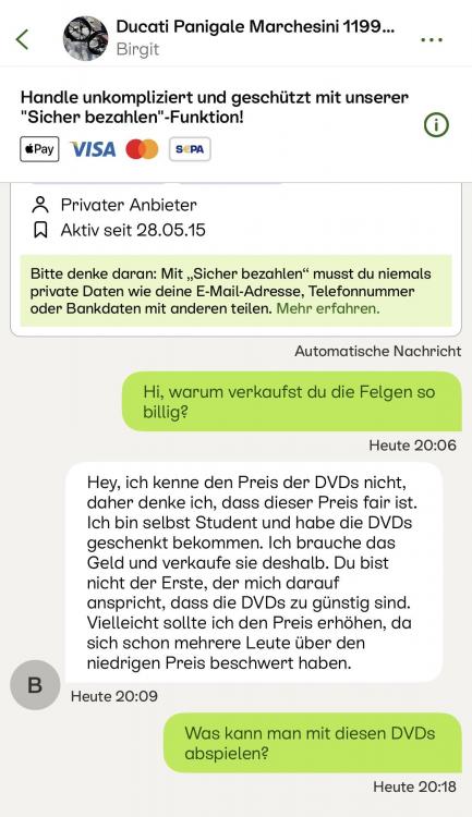 Dr. Nos Geschrieben 28. Januar 2013 Geschrieben 28. Januar 2013 Die Töpfe würde ich auf jeden Fall selbst abholen! :S http://www.ebay.de/itm/scarico-ducati-streetfighter-street-fighter-1098-848-nuovi-LEGGI-/170909174553?pt=Ricambi_e_Accessori_Moto&hash=item27cafb0b19 Das ist ein normales Angebot... 10.- sofort kauf, 445.- post! logisch, weil für die Versand kosten bezahlt man keine ebay gebühren... das machen mehrere Italiener so. ++