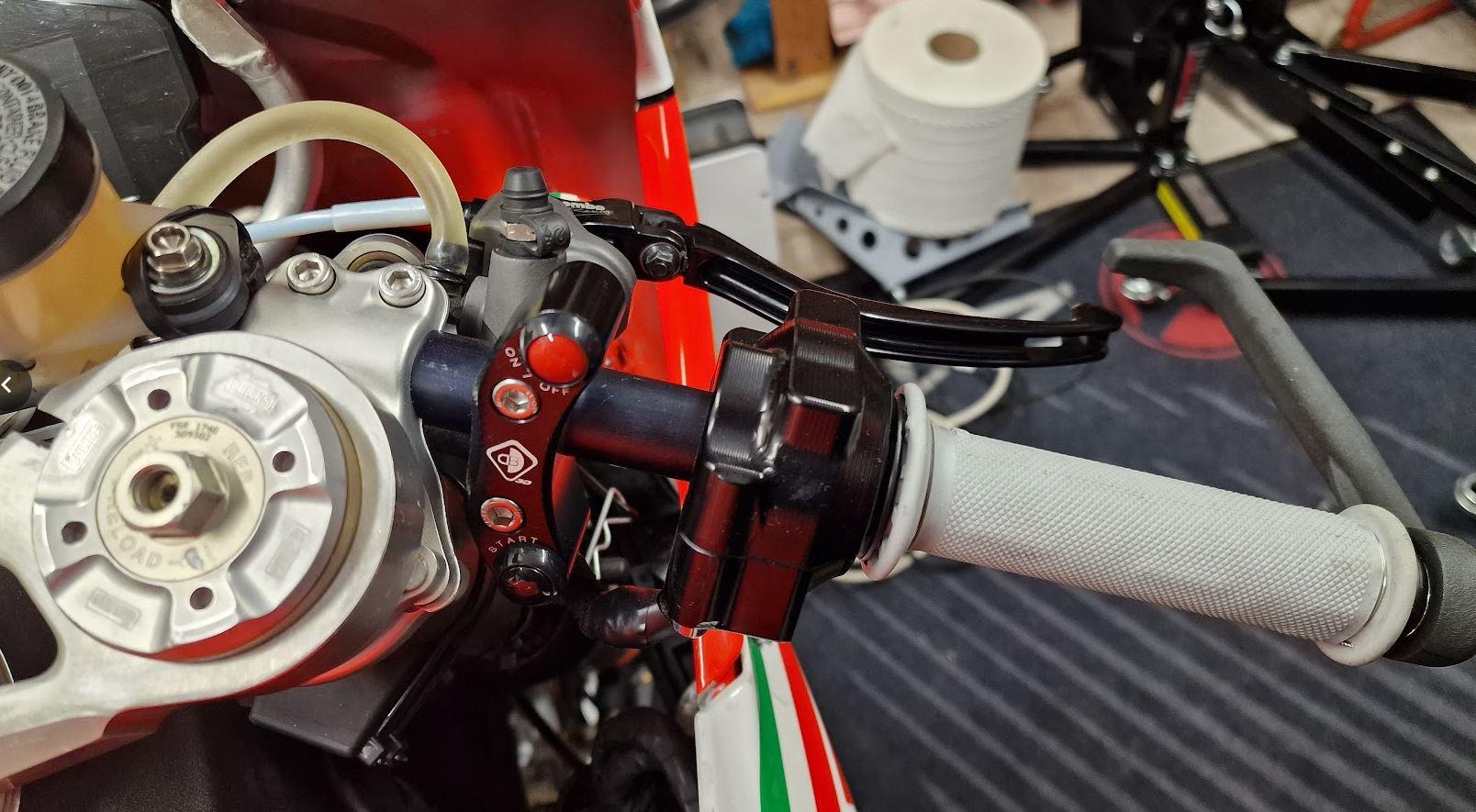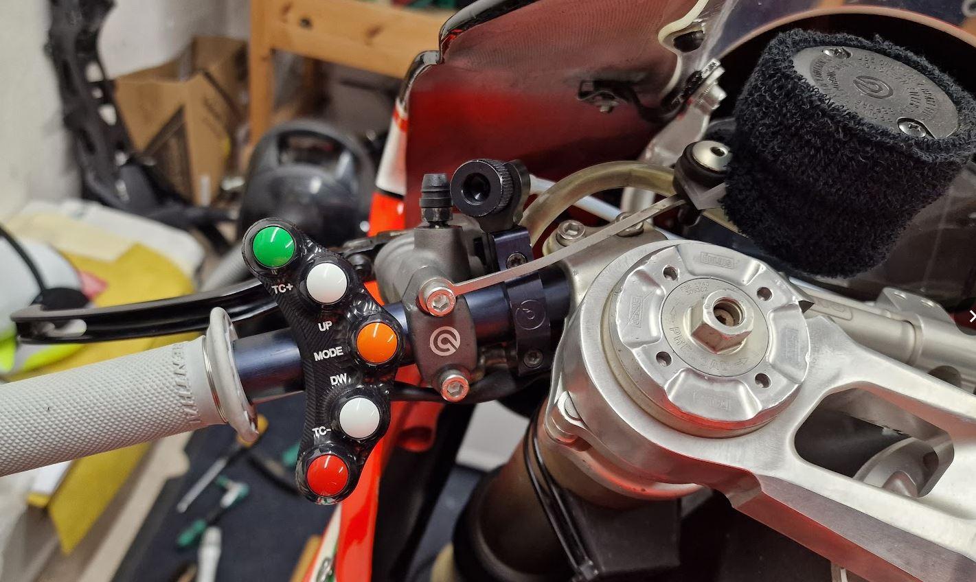 Felix87 Geschrieben 21. Januar 2025 Autor Geschrieben 21. Januar 2025 Kommen wir zum Cockpit der Spaßmobils: Bei der Verkleidungsscheibe fiel die Wahl auf WRS, diese ist mit +5cm deutlich höher als die mir bekannten Alternativen und bietet damit genug Schutz Die originalen Lenkrohre wurden gegen längere getauscht Neuer (vorhandener) Öhlins Lenkungsdämpfer verbaut RCS Bremspumpe + Hebelverstellung links (vorhanden) + RCS Kupplungspumpe Für beide Pumpen die geschlitzten Brembo Hebel Start/Stop Schalter und CNC Gasgriffgehäuse (originales lies sich nicht mehr fest arretieren) Schaltereinheit links (originaler Wählhebel war abgebrochen) Neue Edelstahl/Titan Schrauben überall (tlw. verrostet und vergammelt) Renthal Griffe 3D gedruckter Bremshebelschutz ++