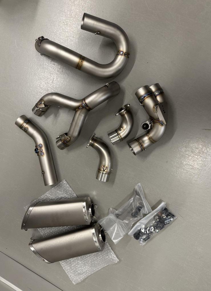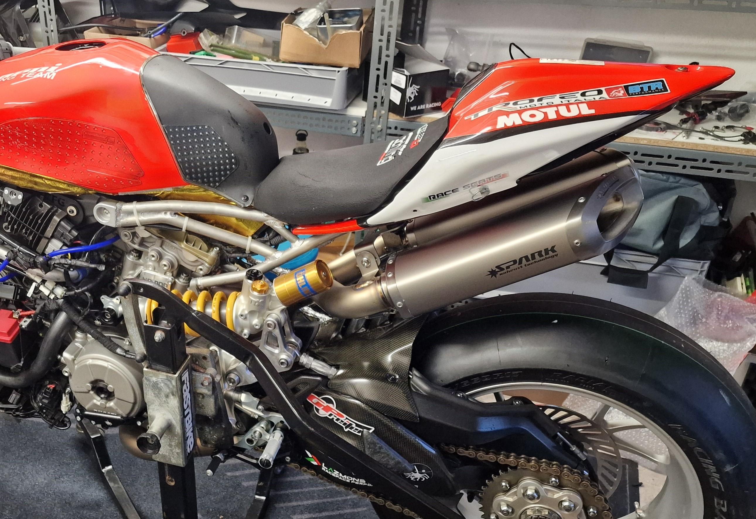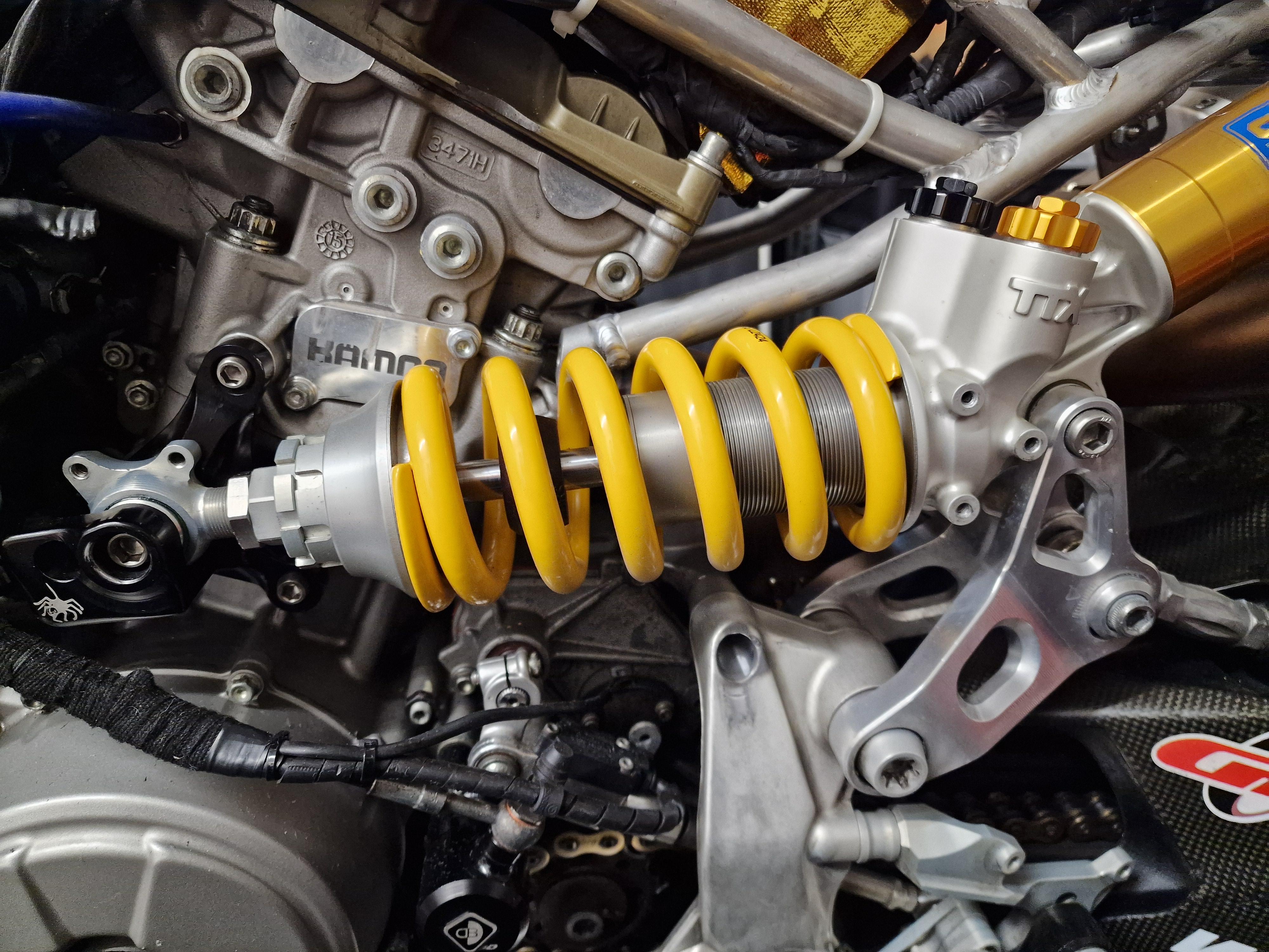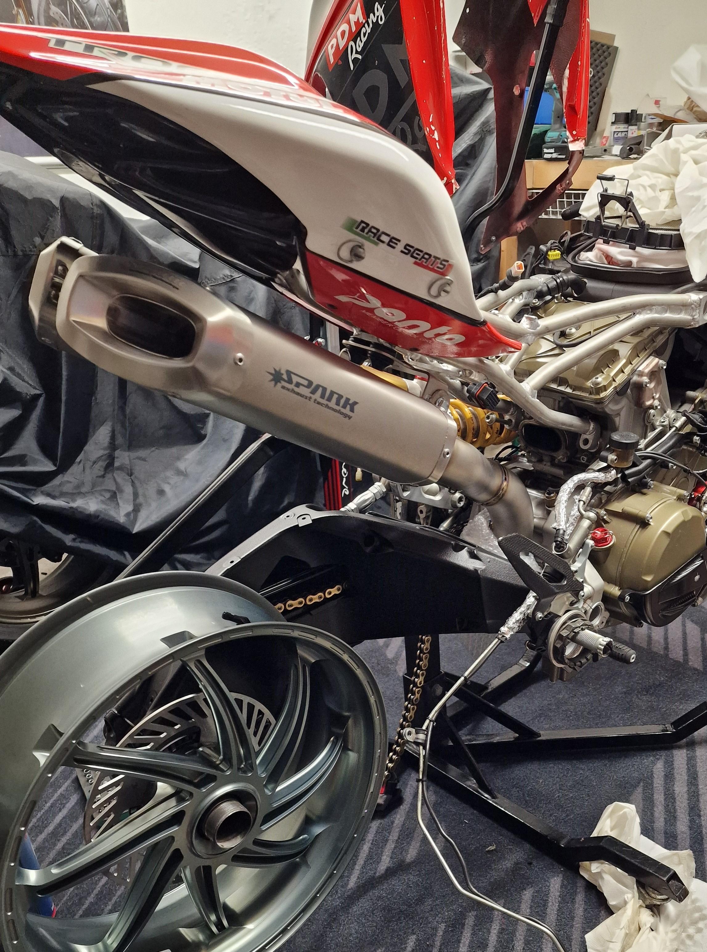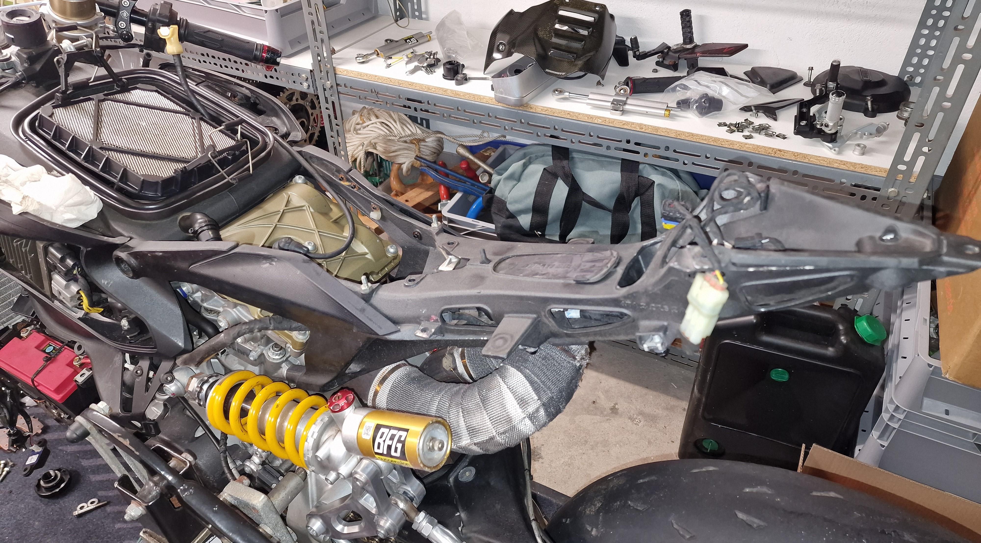 Felix87 Geschrieben 18. Februar 2025 Autor Geschrieben 18. Februar 2025 (bearbeitet) Für das Heck gab es zunächst folgende Änderungen: Der originaler Heckrahmen wird gegen einen aus zusammengeschweißten Aluminiumrohren getauscht. Über die Passgenauigkeit vom allseits bekannten DB Holders las ich eher negative Erfahrungsberichte und persönlich war mir der Pedant von Pieroborn zu kostspielig. Über WRS wurde ich auf eine kleine Schmiede aus Bologna - DM Telai - aufmerksam und bestelle für ca. 415€ den Heckrahmen in Alu natur: wunderschön gefertigt und absolut passgenau 👍 Bei der Auspuffanlage hielt ich aufgrund der Optik Ausschau nach einer gebrauchten Termignoni D170 - dann kam hier über das Forum ein unschlagbares Angebot für eine neue Spark Volltitan-Anlage bei dem ich nicht nein sagen konnte. Ursprünglich für die V2 Modelle (2020-24) und WSSP entwickelt, aber absolut identisch von der Pass- und Einbauform. Die Anlage ist sehr gut verarbeitet und eine Freude anzusehen - das Ganze bei einem Preis deutlich unterhalb der Termignoni oder vergleichbaren Akrapovic-Anlagen. Es gibt 3 verschiedene Endtöpfe zur Auswahl, die Wahl fiel auf die größte Variante, auch weil sie - bei leider immer strengeren Beschränkungen der Strecken - von den drei die leiseste Variante ist und die Möglichkeit besteht, DB-Eater zu verbauen. Persönlich glaube ich, dass sich die Underseat-Anlagen aufgrund der längeren Krümmer positiv auf die Leistung(sentfaltung) auswirken und man doch etwas Hitze von der Ölwanne weg Richtung Heck bekommt. In den letzten Jahren des V2 Motors in der WSBK ist man ja auch den Weg von under-engine zu under-seat gegangen. Das originale (Sachs?) Federbein hatte zwar eine Öhlins Feder verbaut, aber musste ebenfalls weichen. Ein gebraucht erworbenes elektronisches Öhlins Federbein wurde auf mechanische Versteller umgebaut und bekam in diesem Zuge gleich einen Service - Danke an @Andy.S 🔧 Weil der Tank gerade ab war wurde der verbaute K&N Luftfilter überprüft. In dem fanden sich erstaunlich viele Erinnerungen und Rückstände aus diversen vergangenen Einsätzen. Er wurde einmal gereinigt und geölt, letztendlich habe ich dann aber doch einen neuen Sprint P08 verbaut. Bearbeitet 18. Februar 2025 von Felix87 9 ++