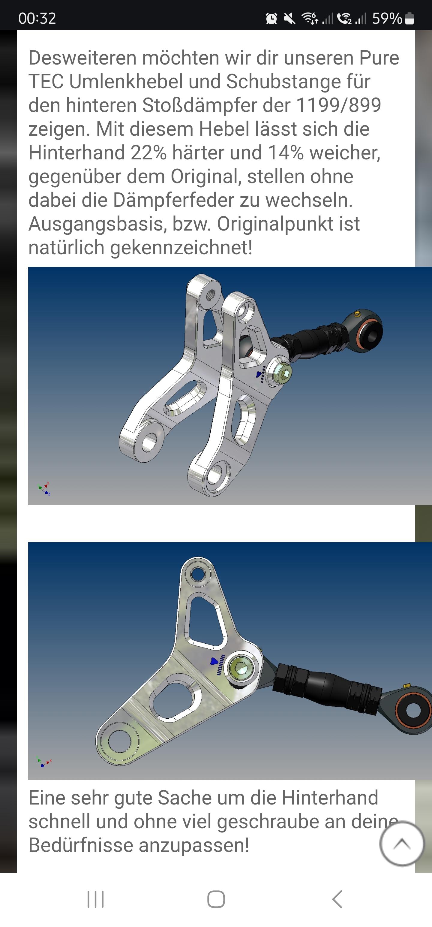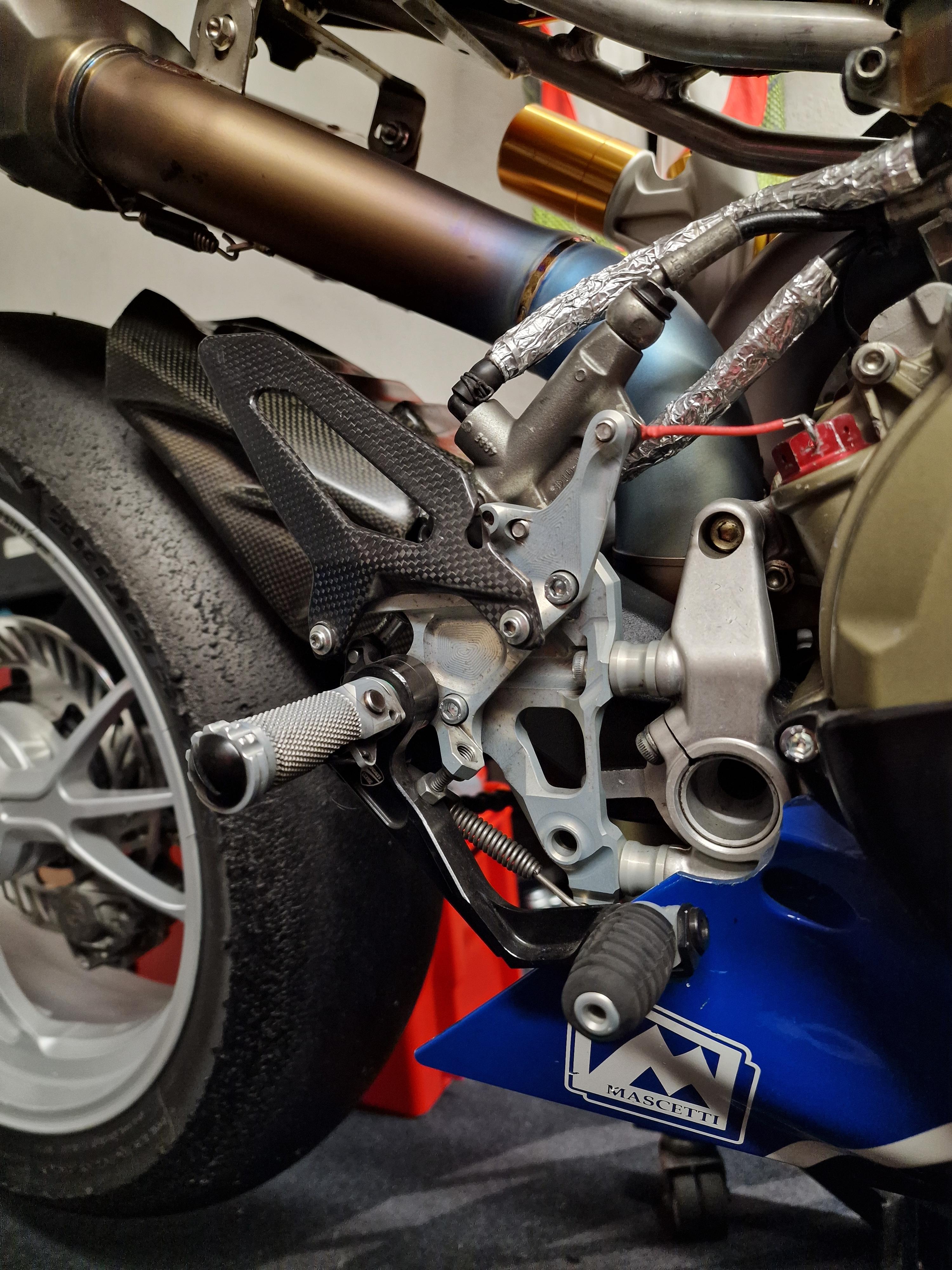 Felix87 Geschrieben 16. Januar 2025 Autor Geschrieben 16. Januar 2025 (bearbeitet) Bereits vom Vorgänger verbaut war eine Lightech Rastenanlage. Die hatte durch einen Sturz bereits Ihre besten Tage hinter sich und wurde abgebaut @alle: Ich verschenke die verbliebenen Lightech Rasten-Teile als Ersatzteilespender - bitte einfach bei mir melden. 🎁 Ich hatte noch eine original Ducati Performance / Corse Rastenanlage zu Hause, die ich mangels Zulassung nicht am Straßenbike verbaut hatte. Ebenfalls bereits montiert war eine CNC-gefräste Umlenkung und verstellbare Schubstange von Kämna (Hersteller PureTEC). Neben der Heckhöhe kann durch die verstellbare Anlenkung und damit Hebel an der Wippe die Federhärte um ca. 15% weicher und 20% härter verstellt werden. Zu verschenken: Bearbeitet 16. Januar 2025 von Felix87 1 ++
