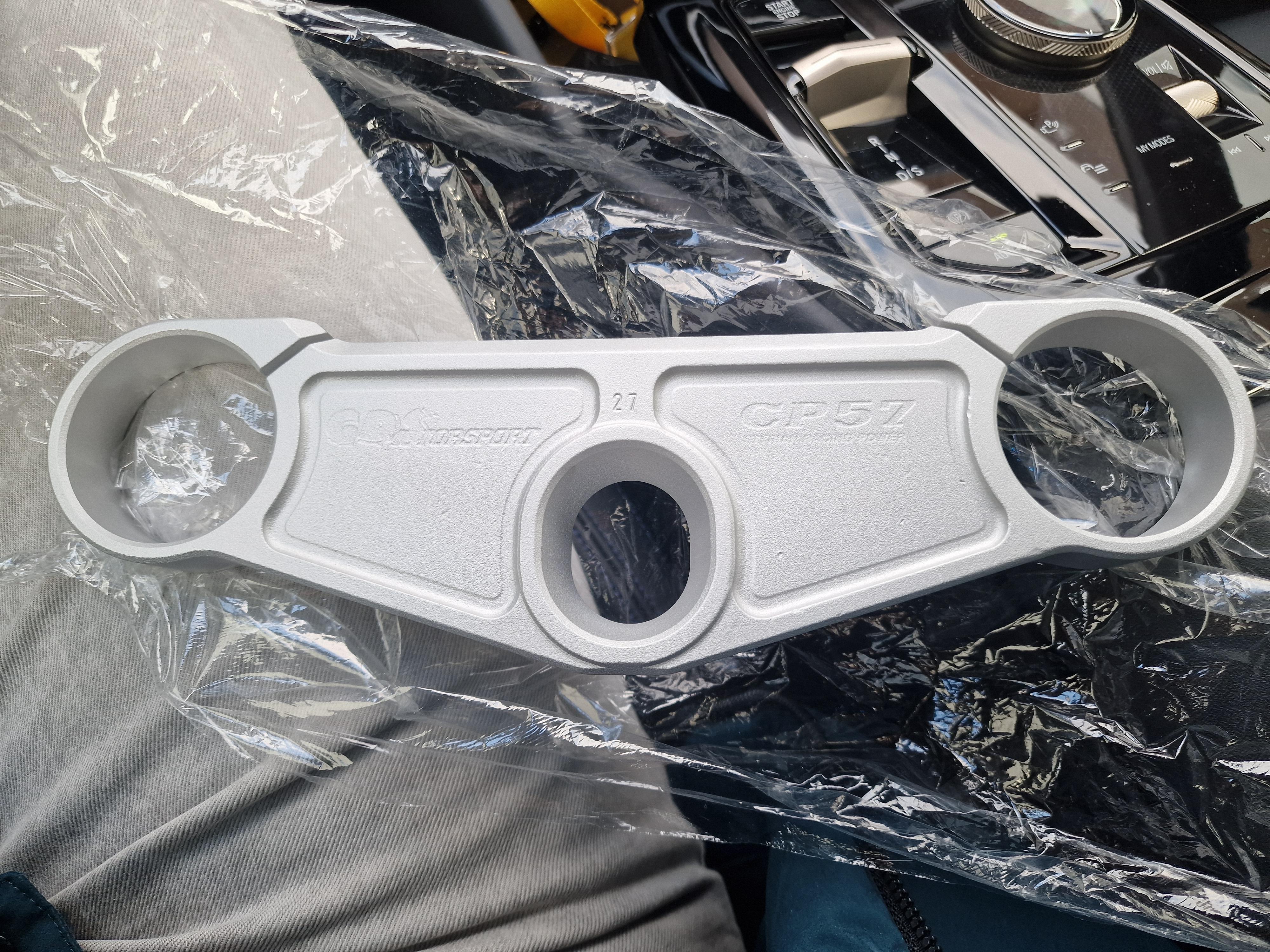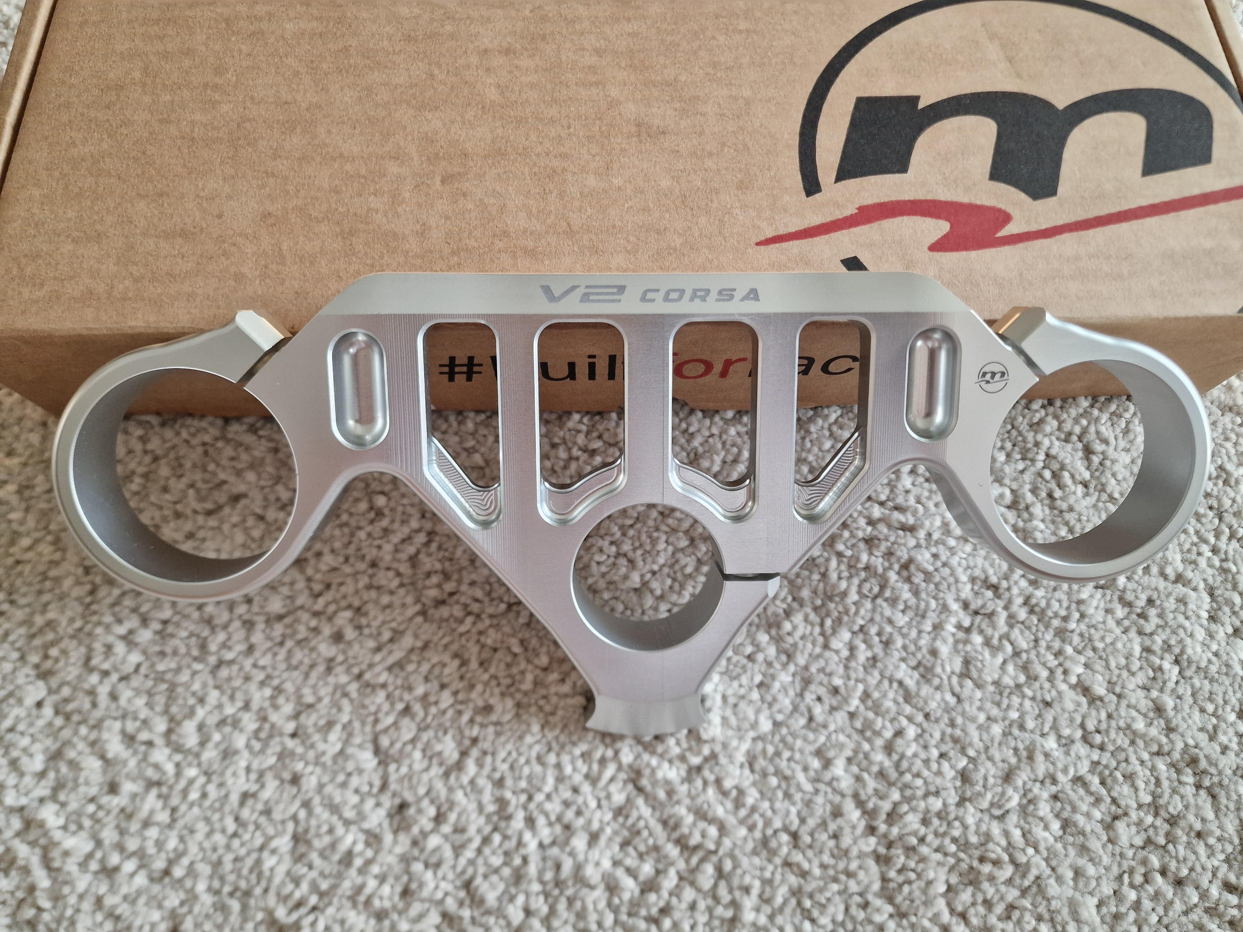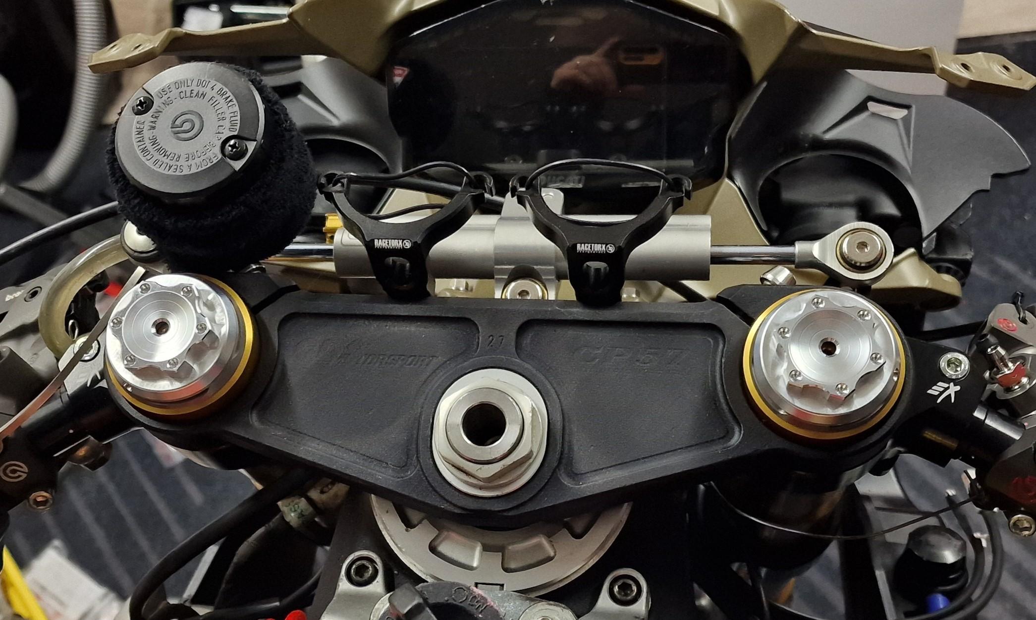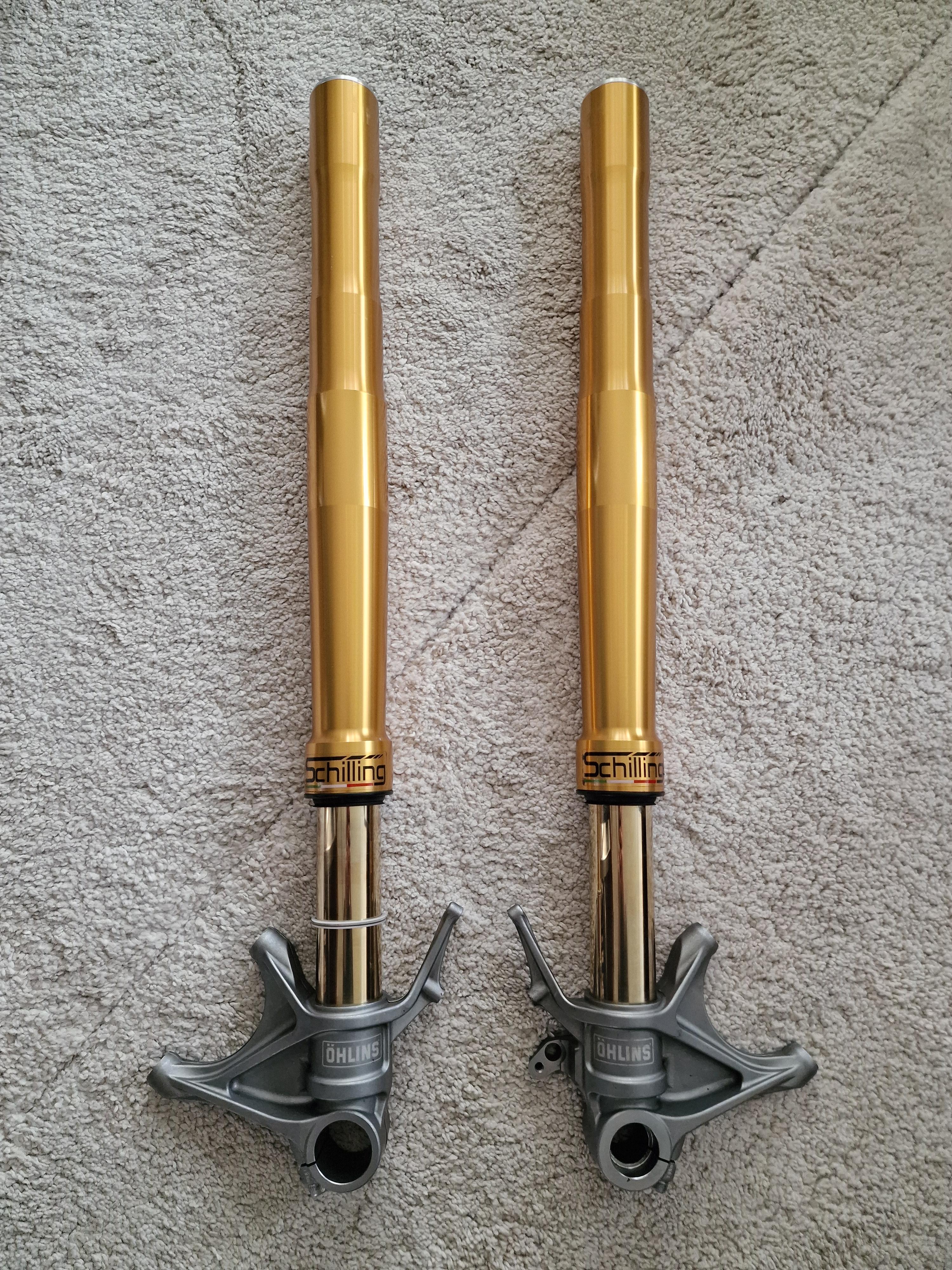 Felix87 Geschrieben 10. September 2025 Autor Geschrieben 10. September 2025 Als nächstes zur Front: Die verbaute original Marzocchi Gabel mit eingebauten Öhlins Cartridge hat m.E. unauffällig gut funktioniert. Aber das Besseres ist ja bekanntlich des Guten Feind. 🫠 Mehr aus optischen Gründen sollte deshalb Schwedengold ans Bike, zunächst habe ich mir eine "Bayliss" Gabel und Gabelbrücke von Melotti aus Italien besorgt - wunderschön gefrästes Teil: Als ich die Teile daheim hatte kam natürlich ein unschlagbares Angebot für eine Öhlins FG Road&Track Gabel rein 🫣 Also zugeschlagen und die Gabel oben wieder verkauft. Dabei blieb es aber nicht, Schilling hatte zum Zeitpunkt gerade ein Racebike zerlegt und ein CP57 Gabelbrückenset mit anpassbarem Offset hat einen neuen Besitzer gesucht. Da der Lack nicht mehr optimal war, hab ich die obere Brücke entlacken und neu pulvern lassen. Für das obere Ende hab es von Racetorx aus England Halterungen für Ausgleichsbehälter mit praktischem Schnellverschluss und gefräste Gabelendstopfen zum Fixieren und ggf. auch Sturzschutz. Für das untere Ende eine Titan-Achse, sehr günstig im Sale in den USA geschossen und aus Holland einen gefrästen PullCup um die Achse leichter rauszuziehen - der wurde gleich mit schwarz beschichtet. Ist also total eskaliert - aber dafür ist ein Hobby ja auch da 😆 5 ++